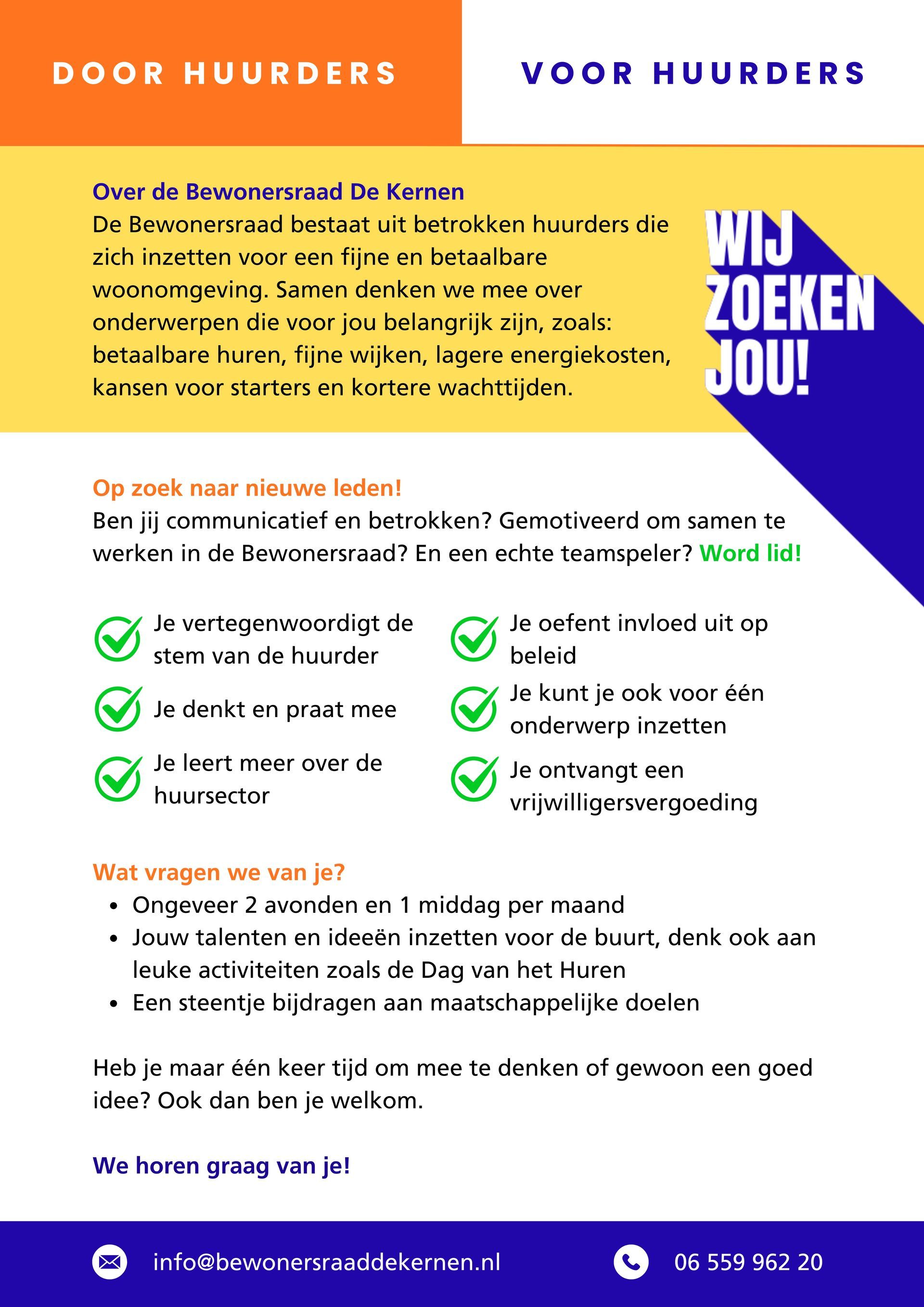 Wilt u zelf ook een steentje bijdragen? Misschien als bestuurslid, meepraten over een bepaald thema, notuleren van de vergaderingen, helpen organiseren van o.a. de Dag van het Huren of heeft u andere kwaliteiten die een meerwaarde hebben voor ons als bewonersraad? Laat het ons weten.